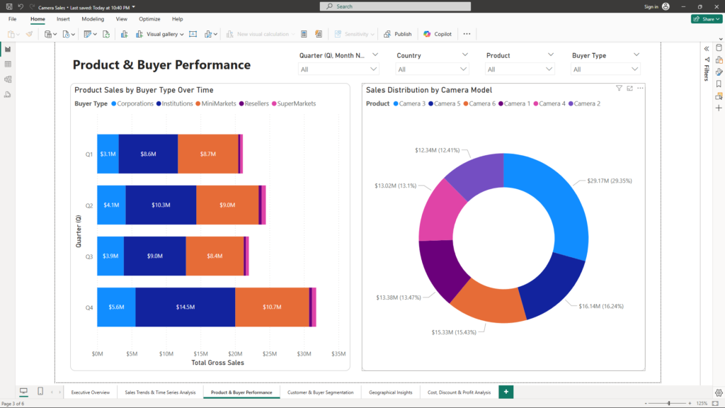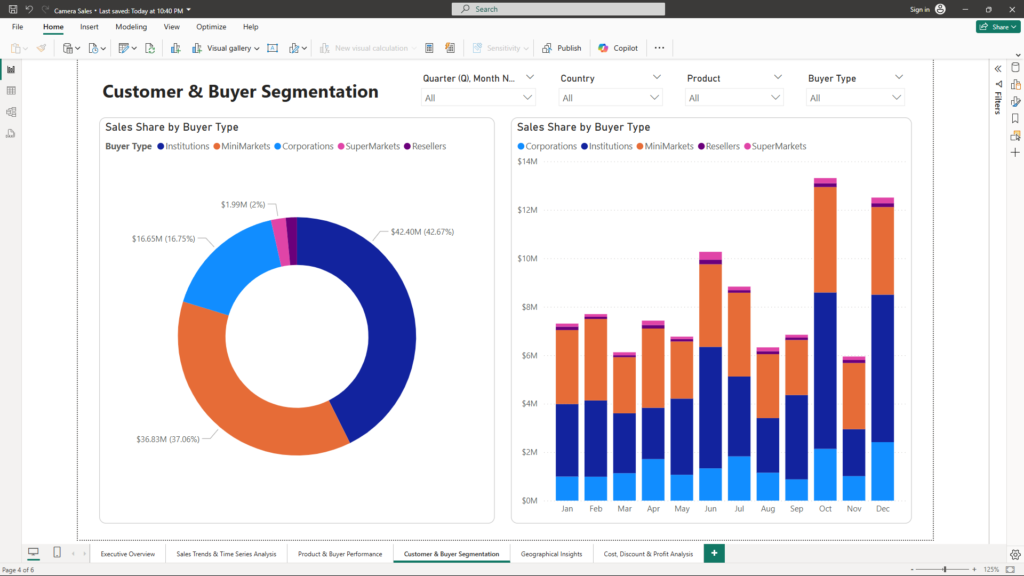 • Sales Share by Buyer Type (Donut Chart & Column Chart) – Helps in identifying the most valuable customer segments and their contribution to total sales.