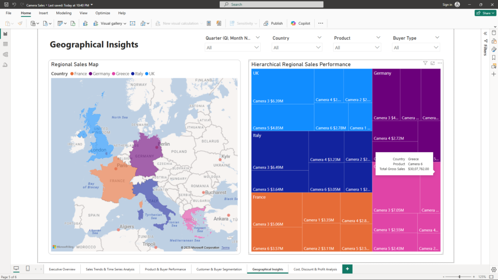 • Regional Sales Map (Map & Filled Map) – Displays sales distribution by country and allows filtering for different time periods to uncover regional trends.