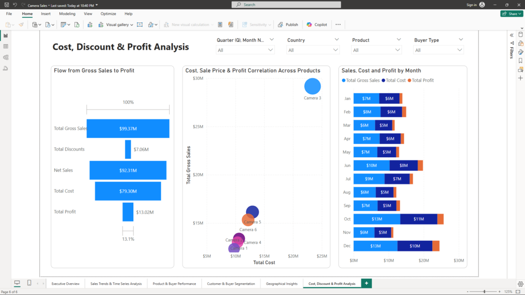 • Flow from Gross Sales to Profit (Waterfall Chart) – Clearly illustrates the financial impact of discounts, costs, and net earnings, allowing better discount policy adjustments.