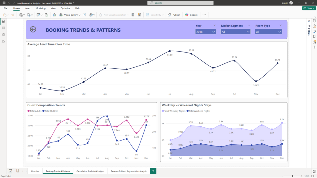 Understanding guest booking behavior is crucial for optimizing both operational planning and marketing strategies. This page highlights key trends, including: