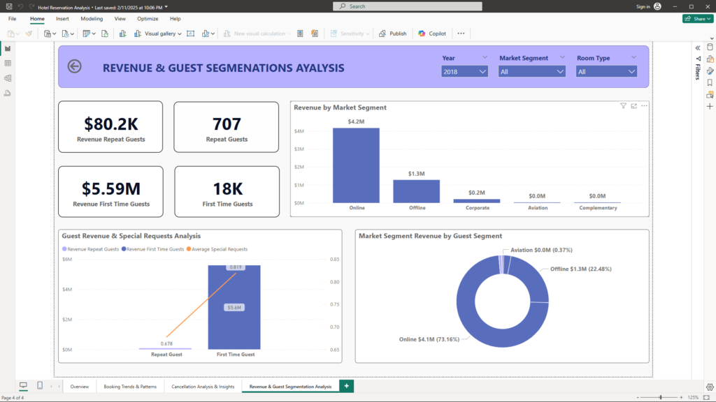 - Market Segment Revenue by Guest Segment Donut Chart: Illustrating the proportional contribution of different guest types within various market segments.
