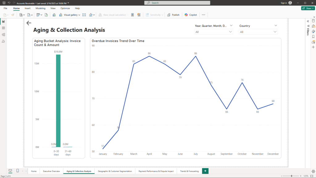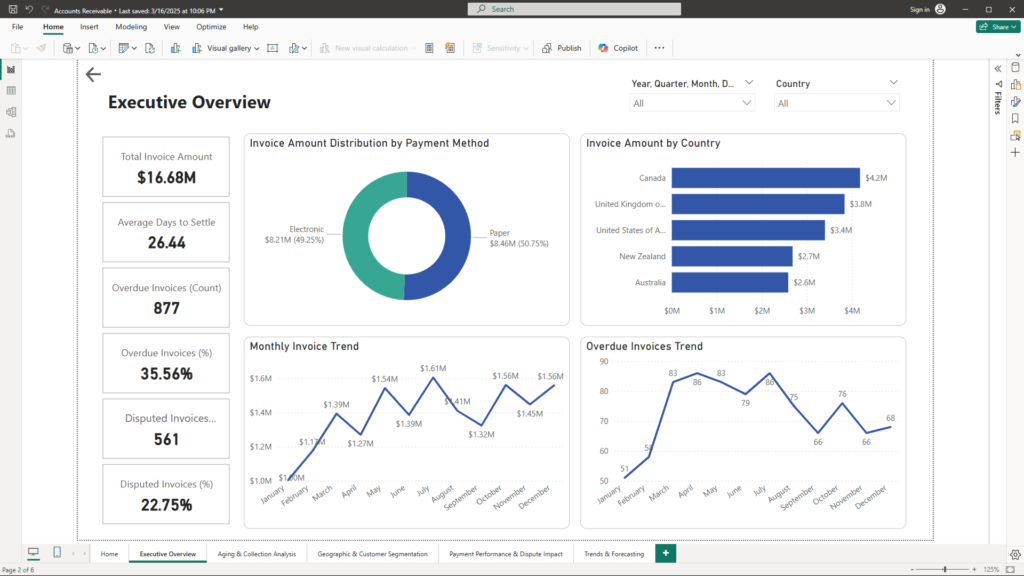 Our Power BI solution has transformed the Accounts Receivable process by turning complex data into clear, actionable insights. Each report—from the Executive Overview to Trends & Forecasting—plays a crucial role in enabling management to: