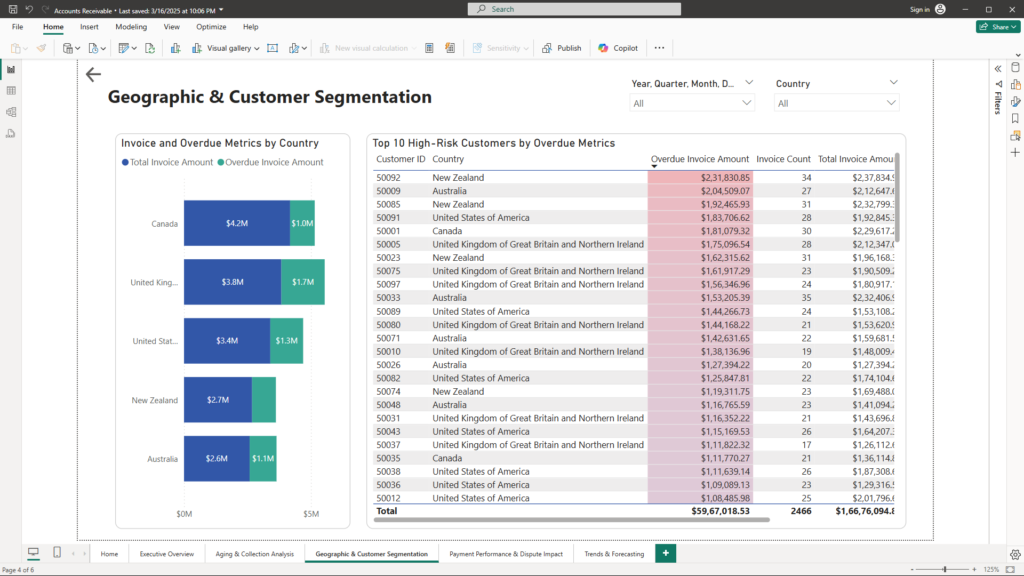 Provide a granular view of AR performance by geography and customer profile to identify high-risk regions and customer segments.