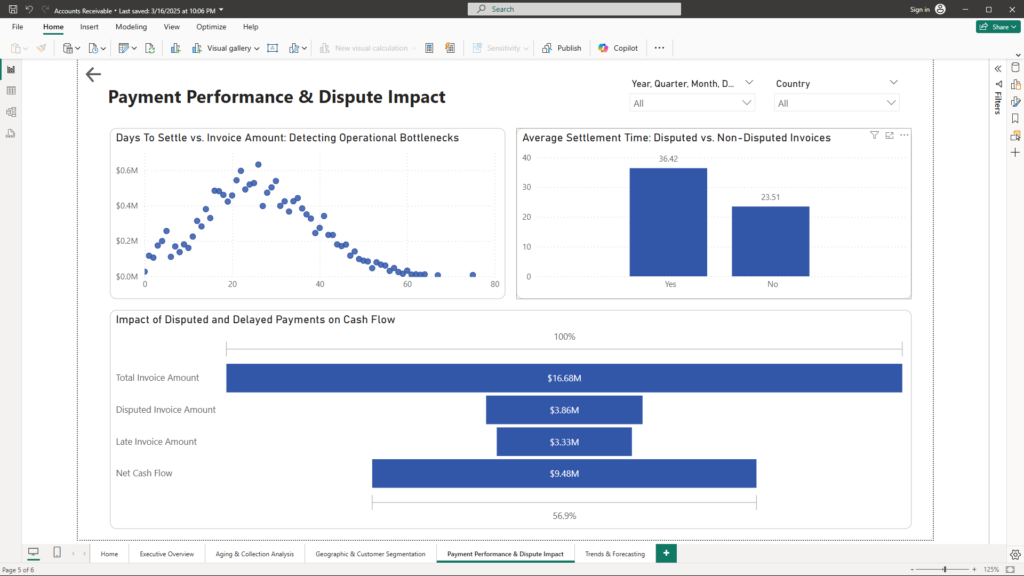 Compares average settlement times to show if disputed invoices are causing delays. - Waterfall Chart – “Impact of Disputed and Delayed Payments on Cash Flow”: