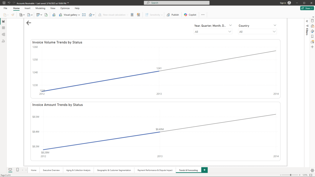 Shows trends in the number of invoices over time, segmented by status (Settled, Overdue, Disputed). Forecasting capabilities extend these trends into future periods. - Line Chart – “Invoice Amount Trends by Status”: