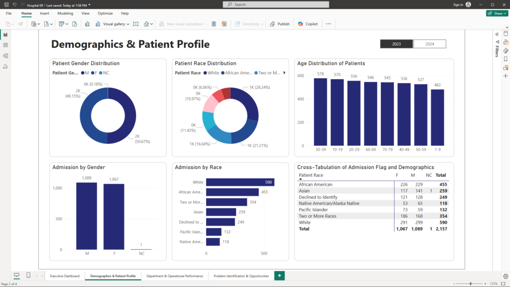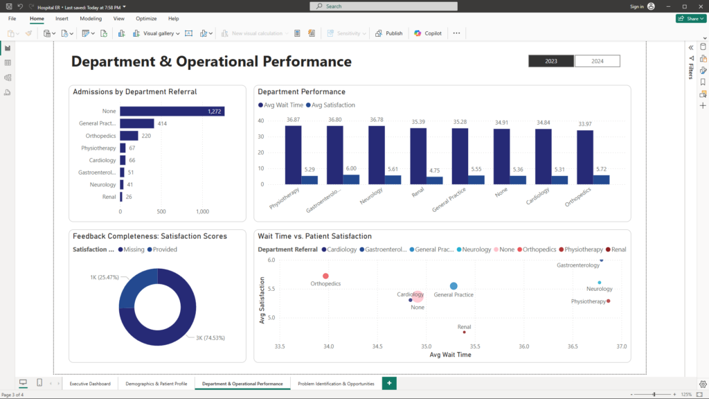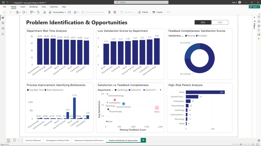 The Hospital ER Analysis case study demonstrates how data analysis and visualization can drive transformative improvements in hospital operations. By leveraging detailed dashboards and interactive reports, hospital management can quickly identify problem areas such as high wait times, low satisfaction scores, and incomplete patient feedback. At the same time, these insights open up opportunities for process improvement, enhanced patient engagement, and targeted care management.