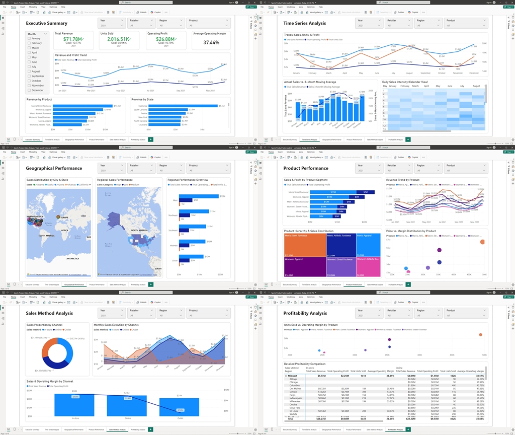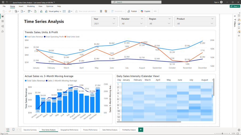 Time Series Analysis focuses on temporal trends to uncover patterns in sales, units sold, and operating profit. This report is essential for identifying both short-term fluctuations and long-term trends, smoothing out daily volatility to reveal the underlying performance trajectory.