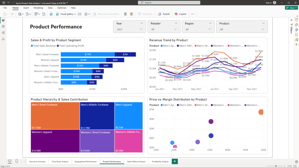 Product Performance analysis dives into individual product contributions and segmentation. It provides insights into which product lines are driving revenue and profit, supporting focused product management and promotional strategies.