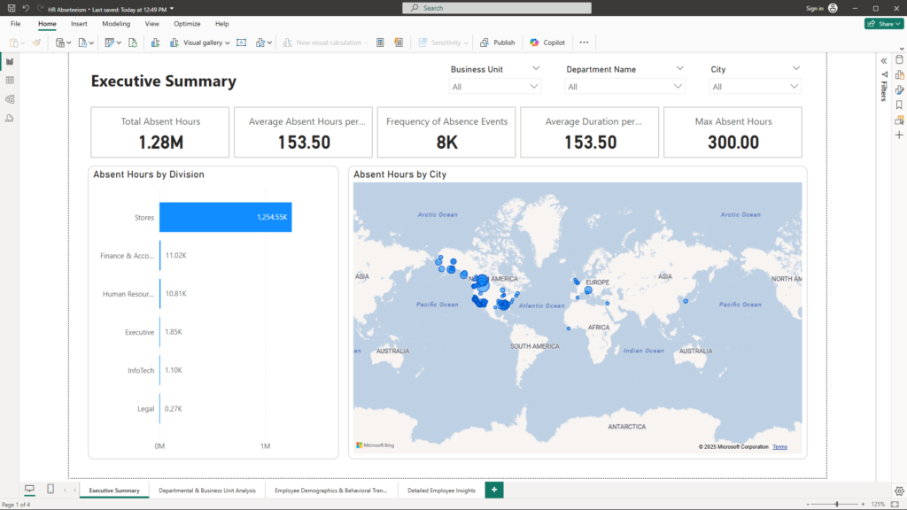 This chart breaks down absentee hours by division, highlighting which divisions are most affected. Business Impact: Identifying high-impact divisions allows for targeted interventions and better resource allocation. - Map – Absent Hours by City: