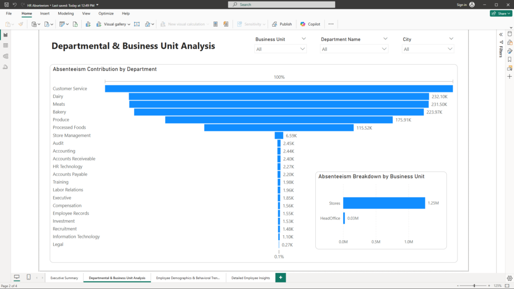 This chart clearly shows how each department contributes to overall absenteeism—both positive and negative changes are visualized. Business Impact: It enables leaders to spot departments that are outliers, prompting further investigation and remedial action. - Bar Chart – Absenteeism Breakdown by Business Unit: