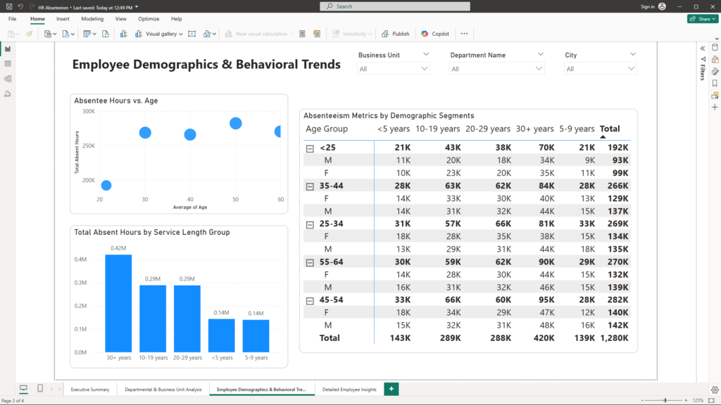 My Power BI solution consists of four detailed report pages, each designed to tackle a different aspect of the absenteeism challenge. The solution highlights key metrics and deep dives into departmental, demographic, and individual insights—all in one interactive dashboard.