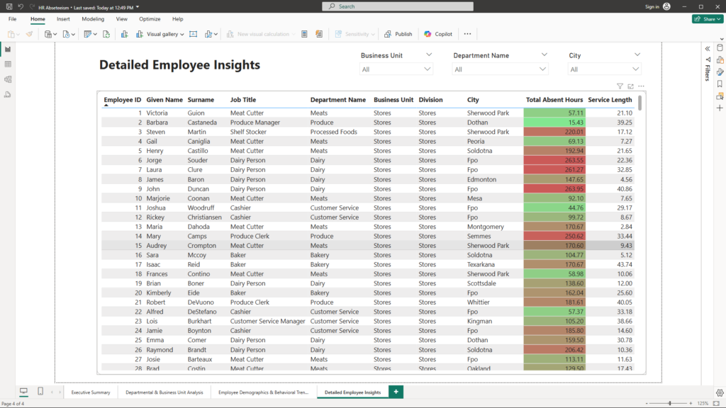 - Table Visual – Detailed Employee Absenteeism: