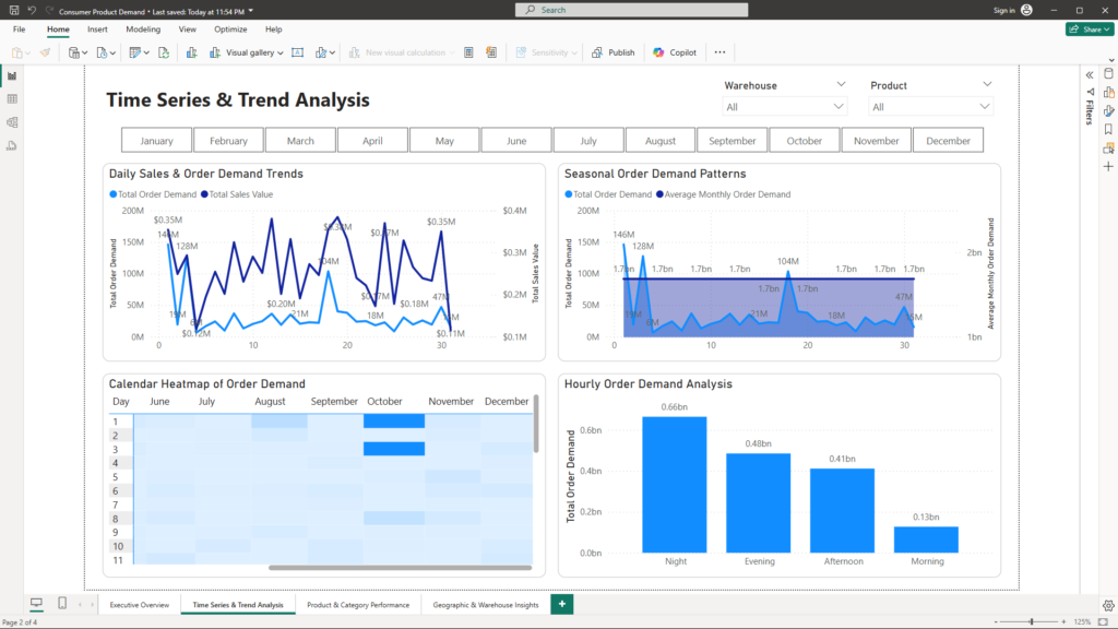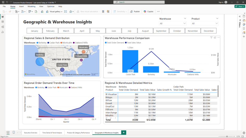 Understanding consumer demand is essential for capturing growth opportunities and addressing operational challenges. A well-designed dashboard—including an Executive Overview, Time Series & Trend Analysis, Product & Category Performance, and Geographic & Warehouse Insights—provides a holistic view of the business landscape. By transforming raw data into interactive, insightful visualizations, companies can detect problems early and uncover opportunities to drive strategic growth and improve overall performance.