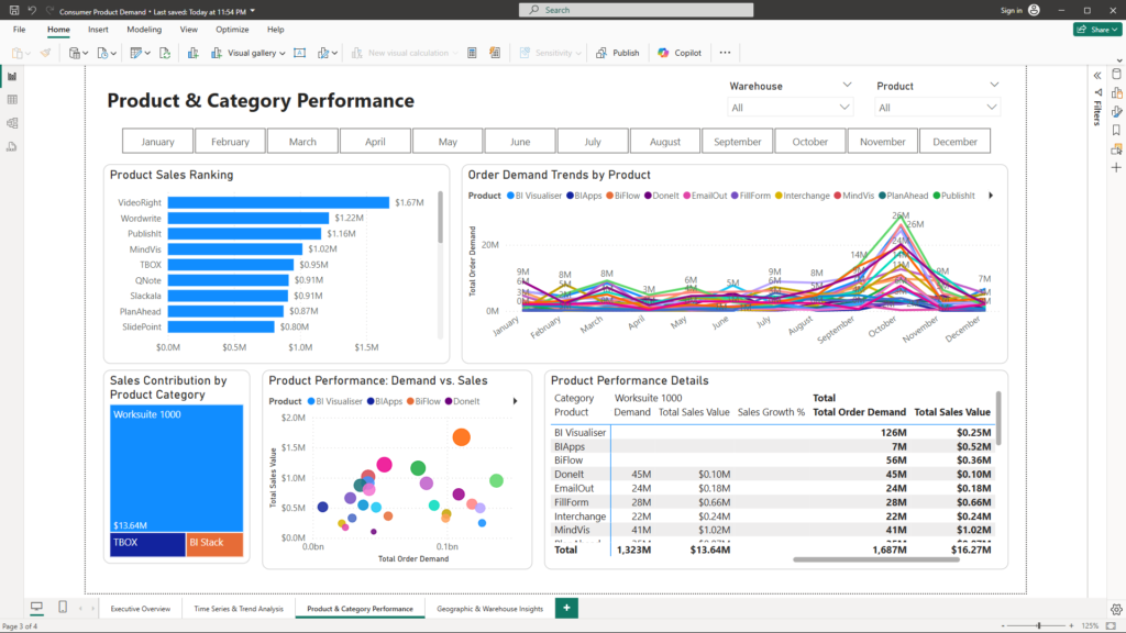 A table or matrix visual lists products along with key metrics such as order demand, sales value, and growth percentages. This detailed view complements the graphical insights with exact figures. - Interactive Filters: